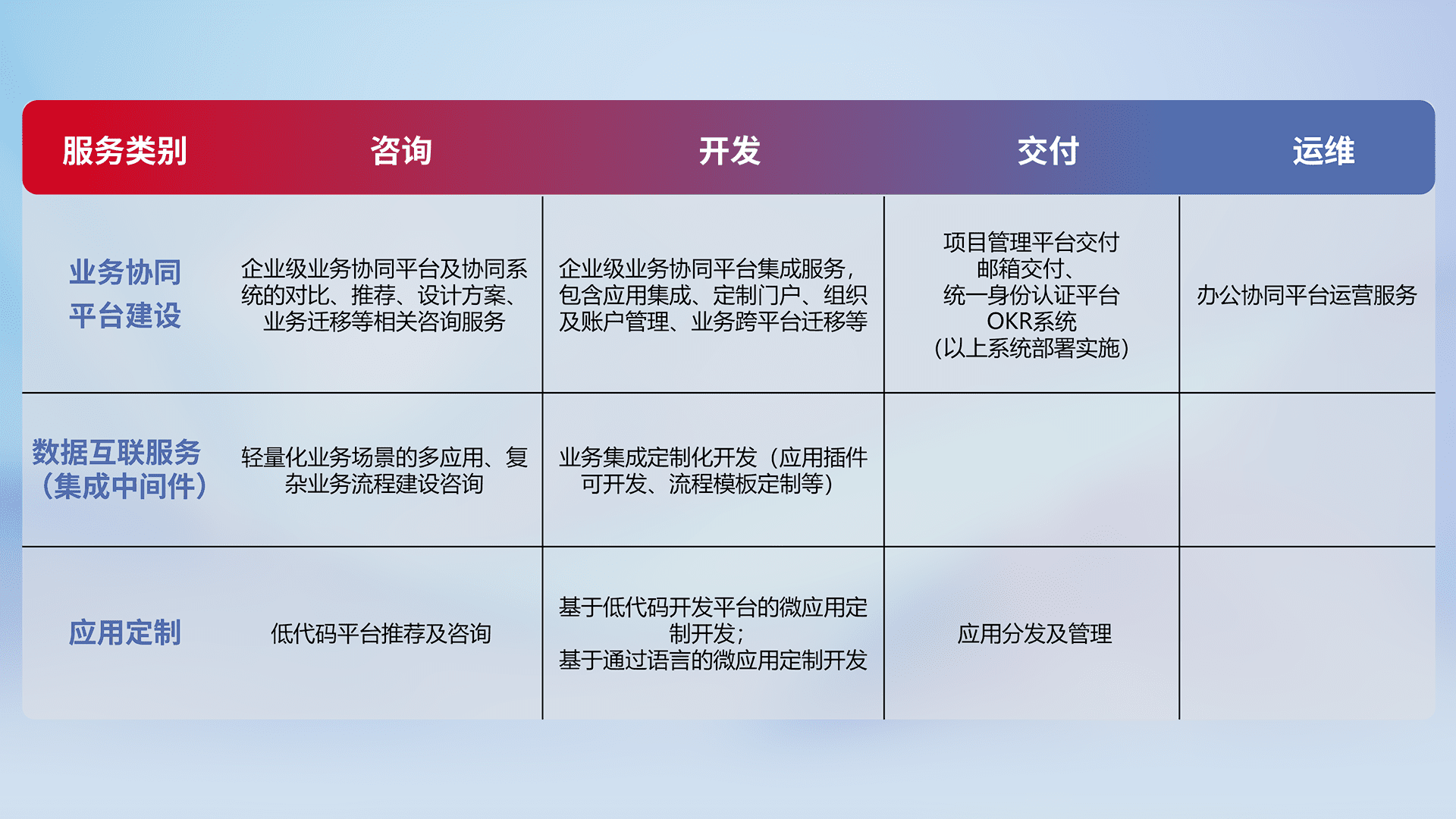 针对钉钉、、企微、、、、IDaas等平台级产品提供产品的规划、、方案、、、交付、、、、定制化开发等服务,,,,实现如统一协同办公、、、、智能客户服务、、、混合会议管理、、、、智能数据查询、、、等业务场景,,,,实现数字化转型。。。